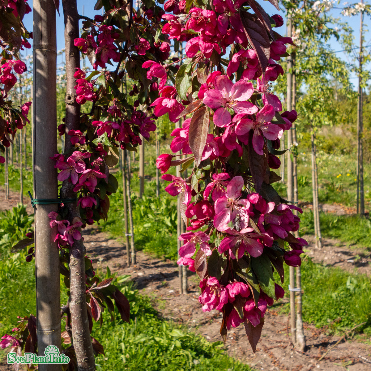 | Litet träd med hängande växtsätt. Rikligt med rosa doftande blommor i maj. Små mörkröda frukter. Vinrött bladverk som övergår i mörkgrönt. Soligt läge, väldränerad jord. Prydnadsträd. Höjd 2,5-3 m, bredd 3,5-4,5 m. Zon 1-4. |