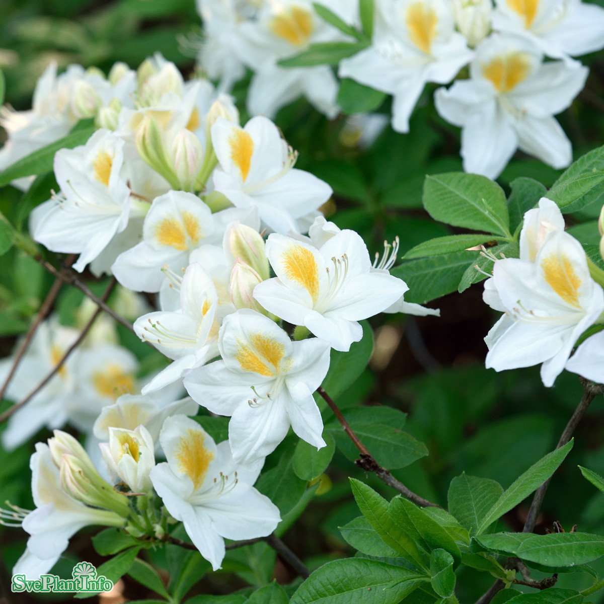 | Buske med styvt upprätt växtsätt. Doftande vita blommor med gul fläck i maj-juni. Friskt grönt lövfällande bladverk. Orangeröd höstfärg. Sol-halvskugga. Väldränerad mullrik jord med lågt pH. Höjd 1,2-2 m, bredd 0,8-1,2 m. Zon 1-4. |