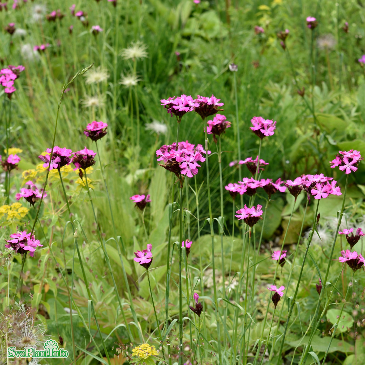 | Tuvbildande perenn. Enkla, doftande, magentarosa blommor i juni-augusti. Gräslikt bladverk. Trivs i sol på väldränerad, kalkrik, något torr jord. Höjd 30-40 cm. Härdighet B*. |
